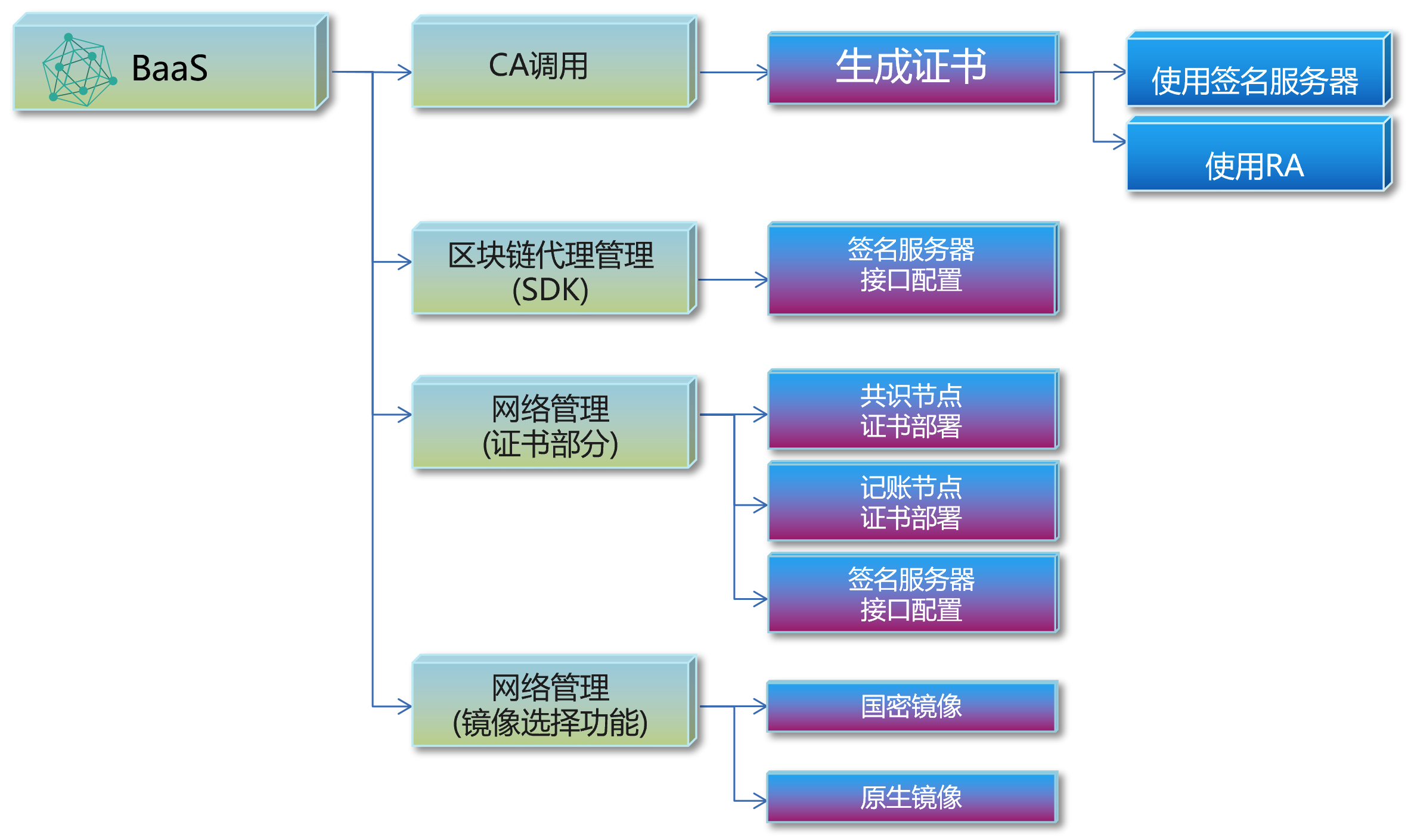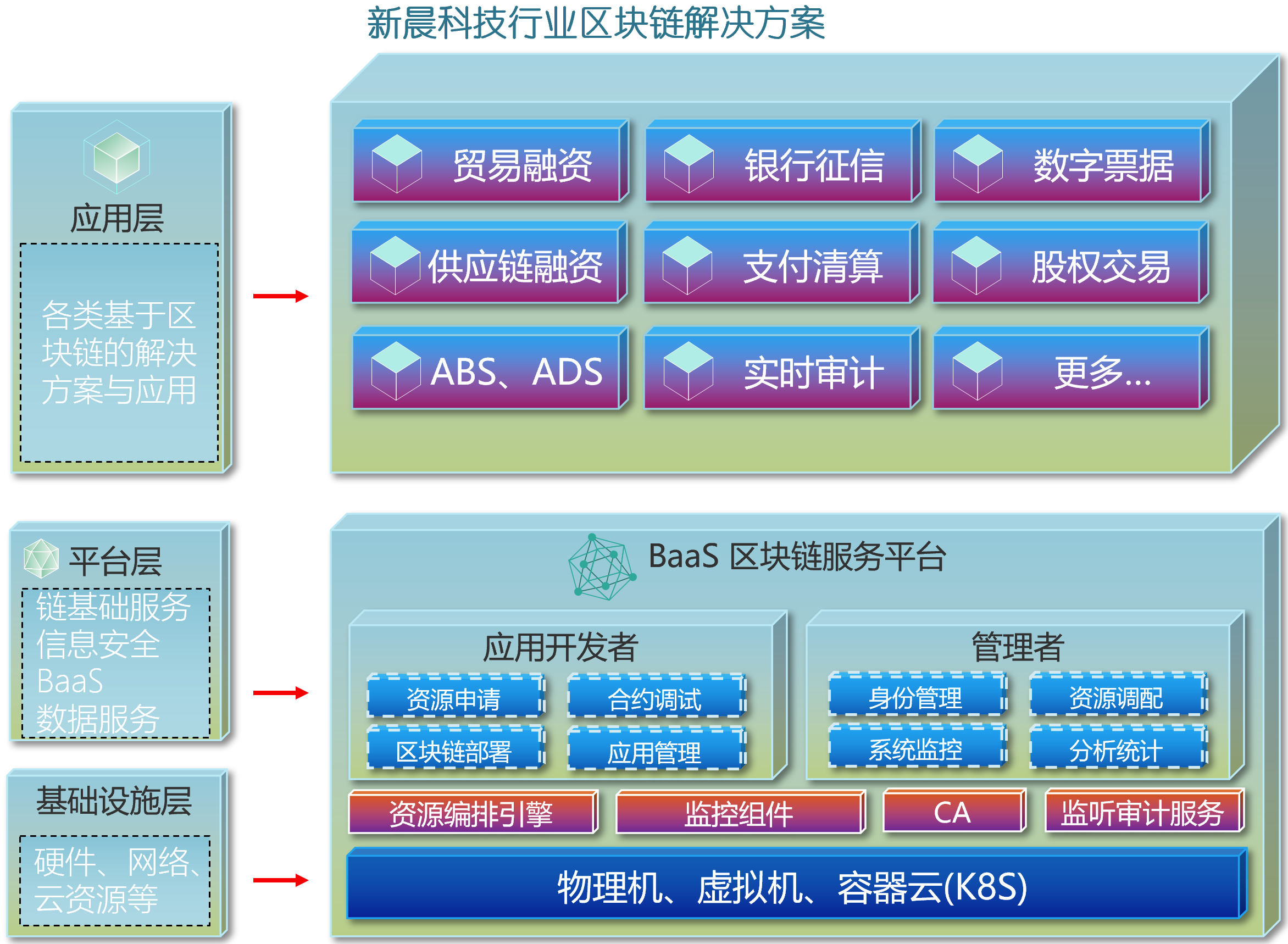 4、链服务平台可直接通过Kubernetes提供链平台所需的各节点容器管理功能,也可以与主流的容器云平台(PaaS层)对接完成相关功能;为企业级部署提供更灵活的选择;
