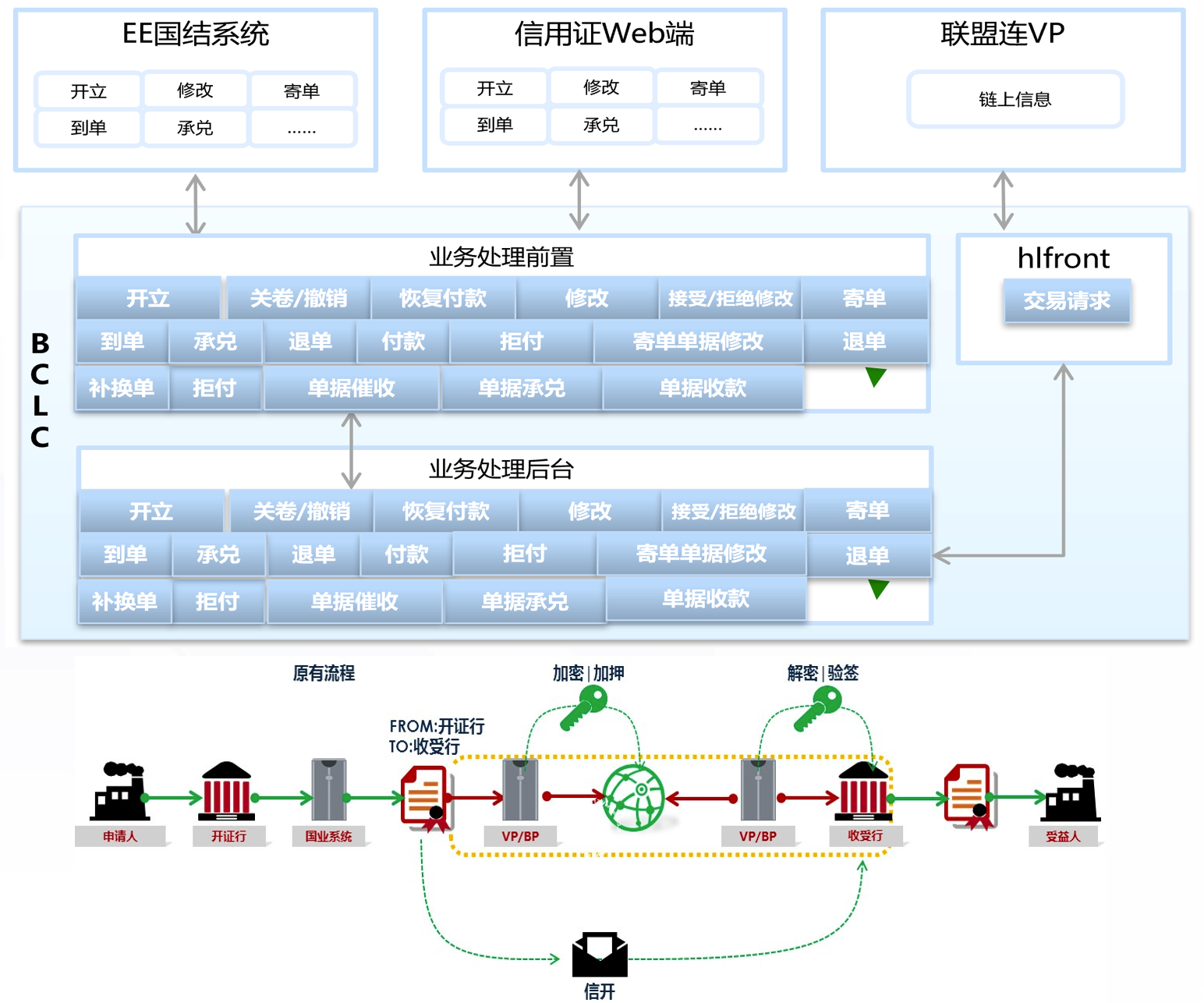 建设基于区块链技术的国内信用证业务信息传输(共享)系统,通过建立银行间非标准业务信息交互的联盟链,替代现有的信开加SWIFT信息传输方式,实现国内信用证业务的安全、高效共享和监督。
